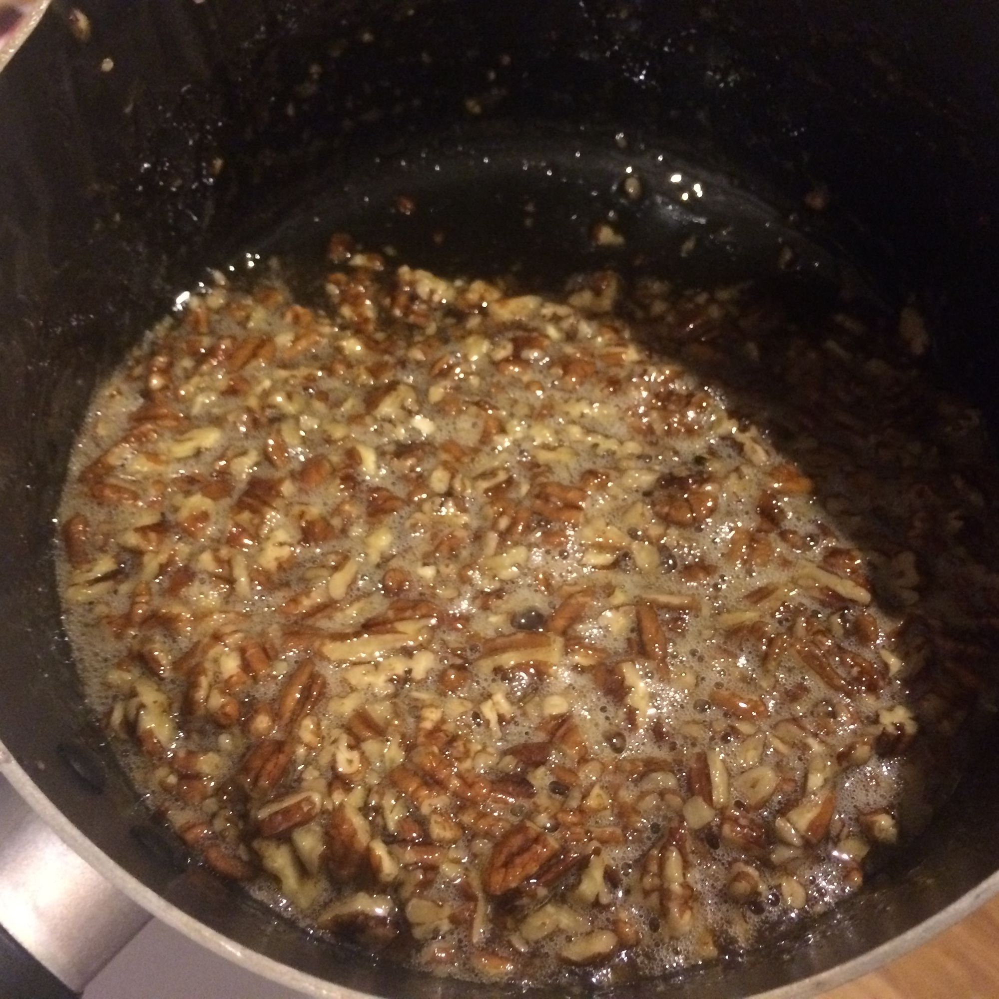 After you make the filling, just look at it! It looks like a bunch of slimy cockroaches! Alas, it's simply a shitload of chopped pecans, butter, brown sugar, and corn syrup. Pour the filling into the premade frozen pie crust.